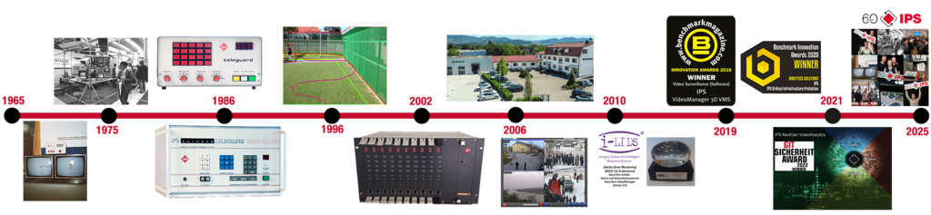 60 Jahre Innovation in Bildern: Die IPS-Zeitreise. Was 1965 als Pionierarbeit in der Videosicherheit begann, ist heute eine der führenden Technologiemarken für intelligente Videoanalyse und Videomanagement.